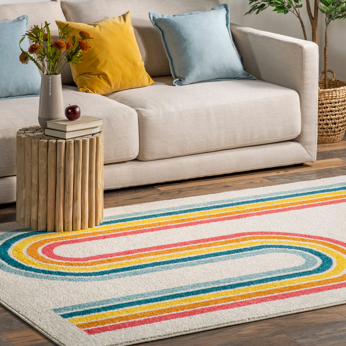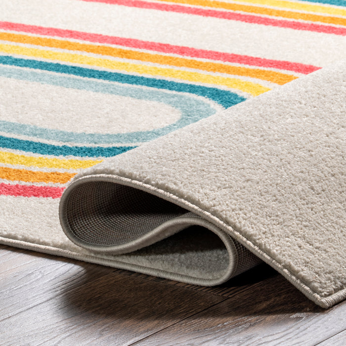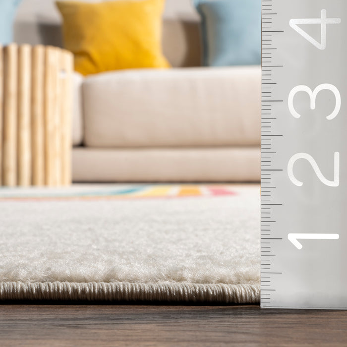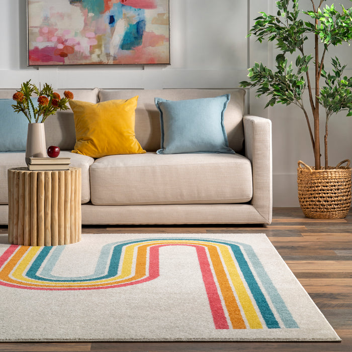 Bring some serenity into your space. Perfect for a nursery, this area rug features a playful rainbow pattern. The luxurious composition offers a soft texture under foot, while the array of colors add just the right amount of sophistication. Choose from a variety of shapes and sizes. Designed to fit seamlessly in virtually any decor scheme. Make the most of your time at home with our pet-friendly and easy to clean area rugs.