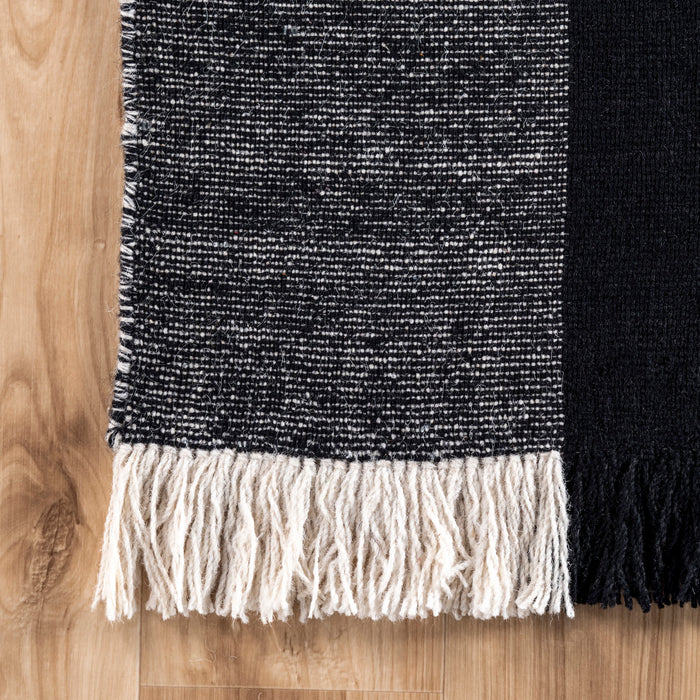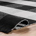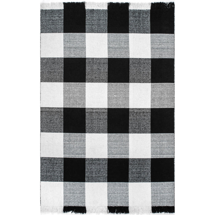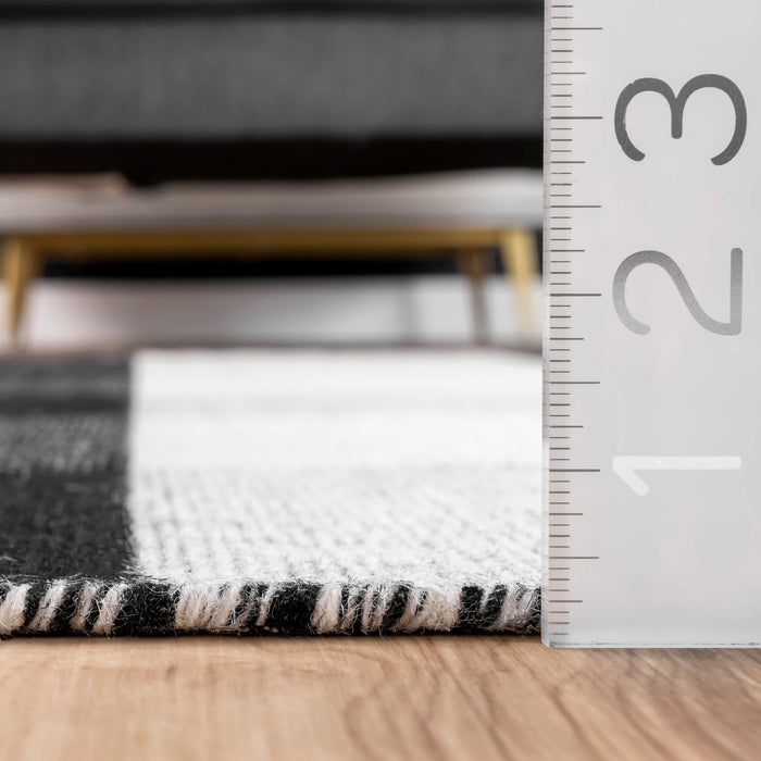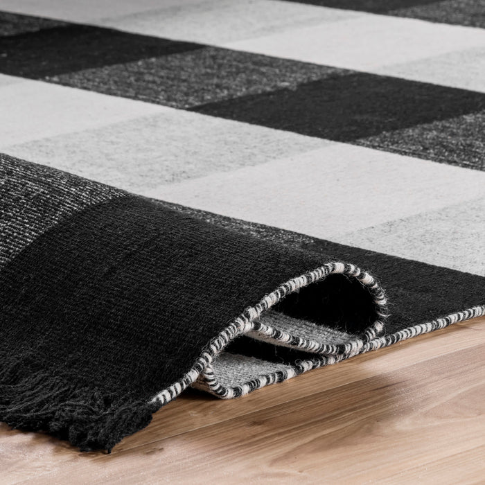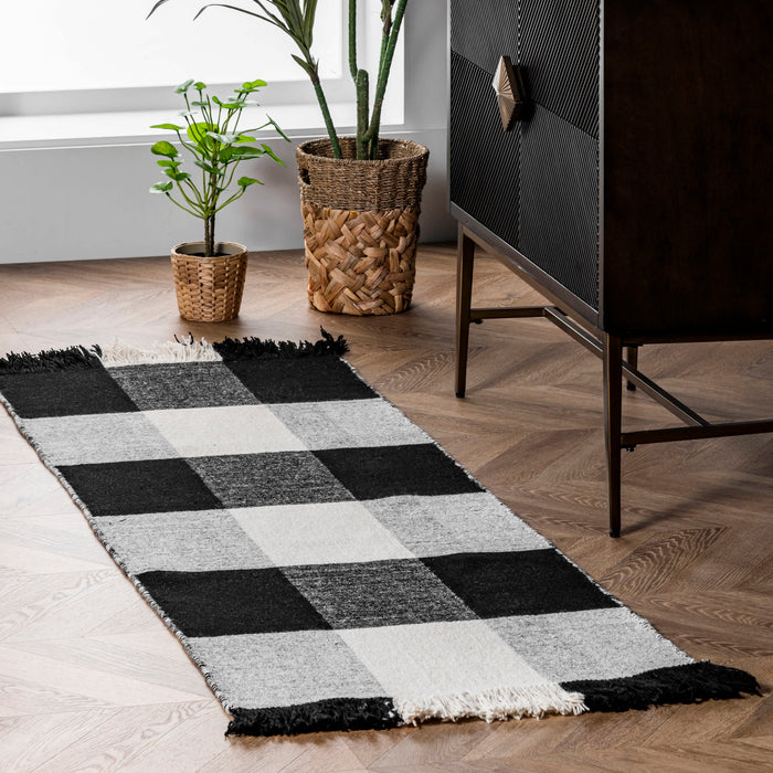 Who doesn’t love a touch of buffalo plaid? This timeless pattern will stand out with its contrasting black and white checkered design. This wool and cotton flatweave rug is completed with a touch of fringe on either end.