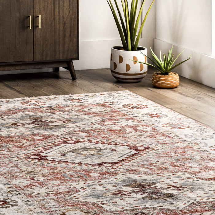 This stunning, timelessly elegant medallion rug is a true statement piece, ready to shine wherever it is placed. Its distressed finish is a delightful finishing touch that exudes a chic yet sophisticated feel. Its power-loomed construction stands up to heavy foot traffic in entryways, hallways and living rooms. Kid- and pet-friendly and easy to clean, our synthetic rugs resist stains and fading.