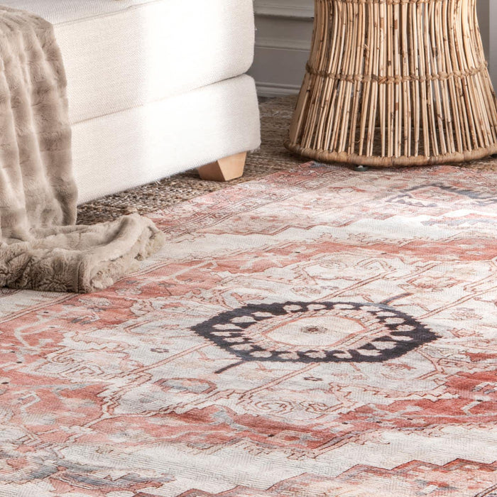 The distressed medallion pattern of this rug blends vintage style with traditional comfort. This unique color combination can add charm to any space.
