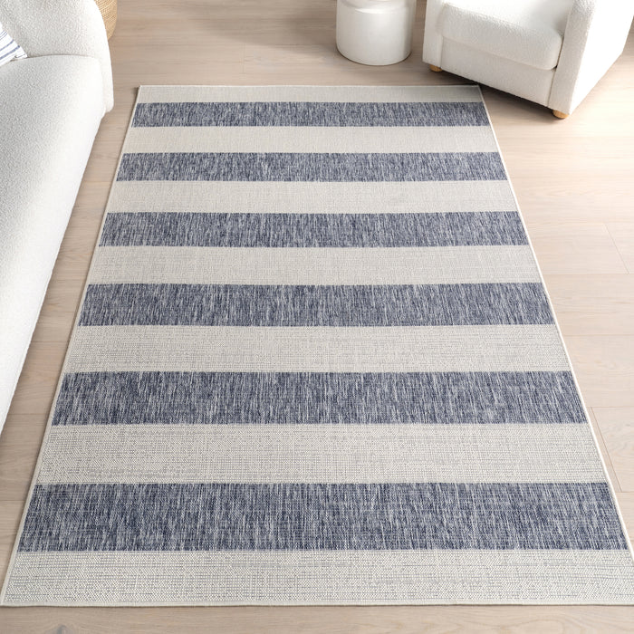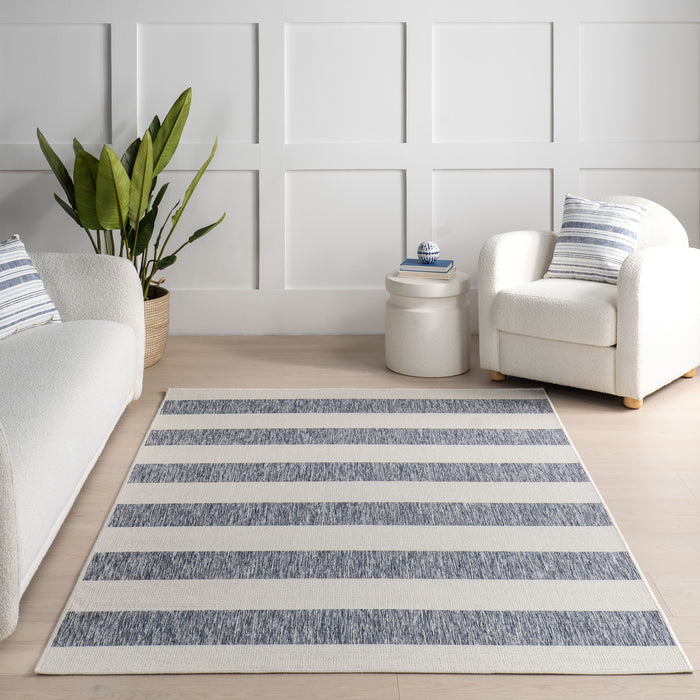 Elevate your living space with our coastal striped area rug, designed for both indoor and outdoor use. Crafted with a non-slip backing and highly durable material, it's perfect for high-traffic areas like the bedroom, living room, dining room, hallway, kitchen, or even your patio. Made from 100% polypropylene, this machine-made rug is not only comfy but also resilient against stains, making it ideal for households with kids and pets. Its thin profile seamlessly blends into any setting while providing lasting comfort and style. Transform your space effortlessly with this versatile and enduring rug, whether for regular indoor use or to add a touch of charm to your outdoor oasis.