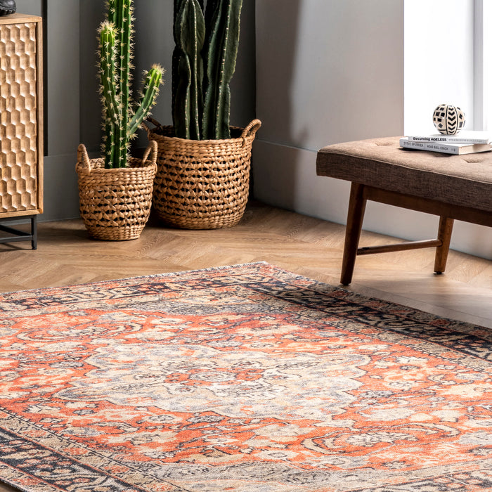 Stylish and versatile this traditional floral medallion rug will make a standout addition to any room in your home. The rustic color palette will add instant warmth. Machine-made with a blend of durable synthetic fibers and lightweight cotton, this rug is built to last and will withstand regular foot traffic.