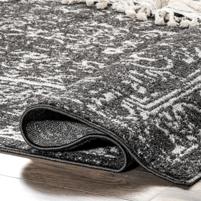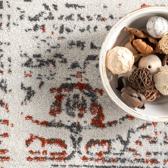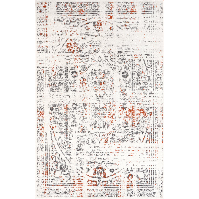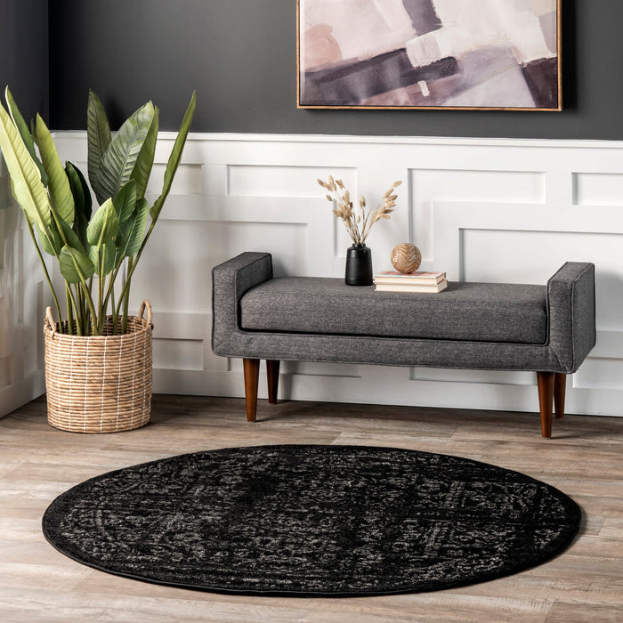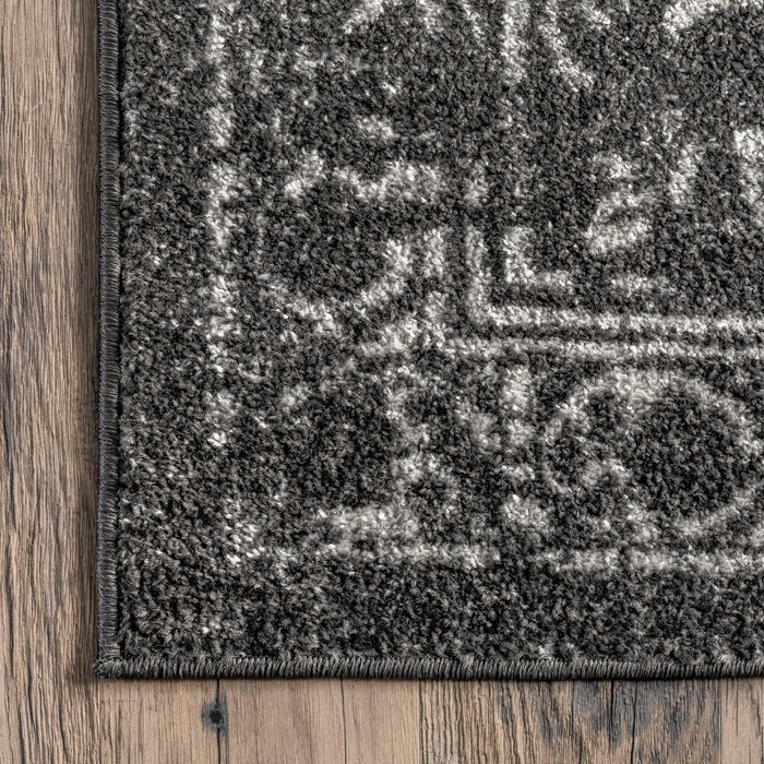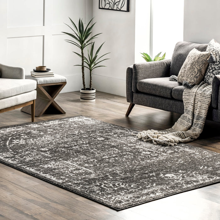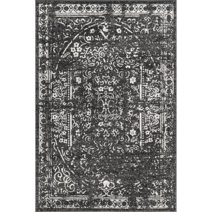 This distressed traditional area rug will be the finishing touch to any room it is placed in. With a beautiful monochrome rosette in the middle of the rug, this floor covering will pair perfectly with any décor from traditional to modern. Machine made in Turkey of soft synthetic materials this rug is built to last. Create the home you have always dreamed of with our pet-friendly and easy to care for area rugs.