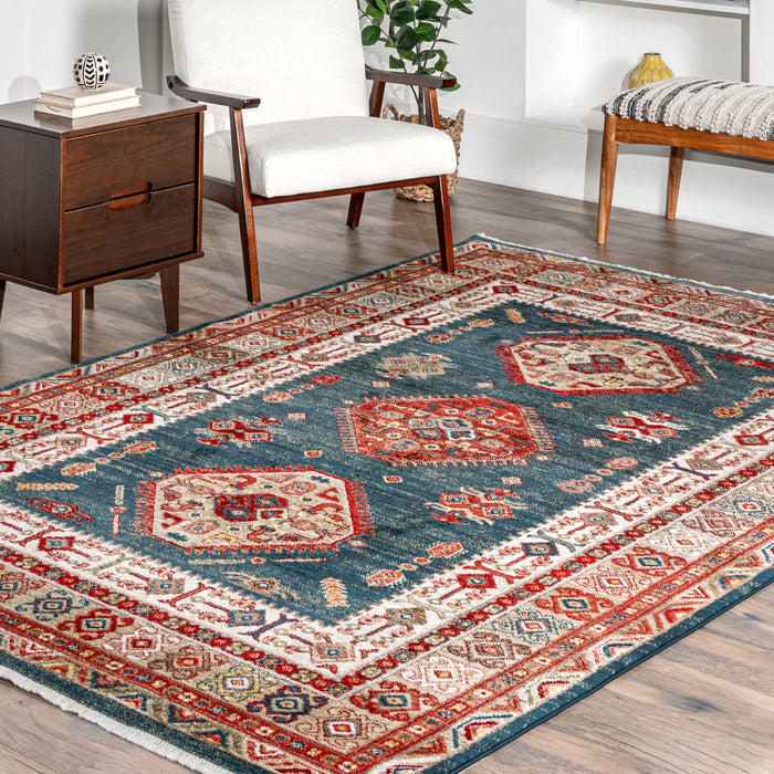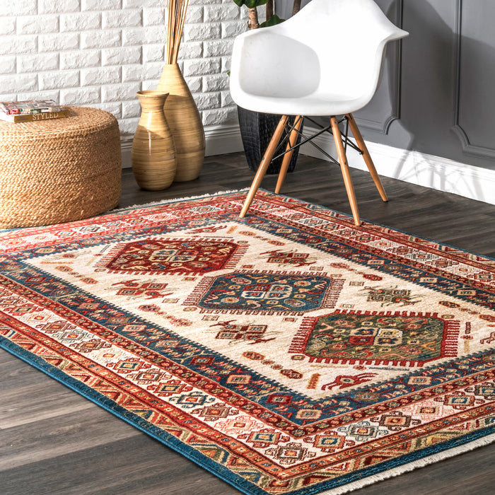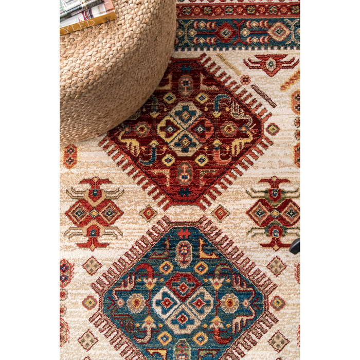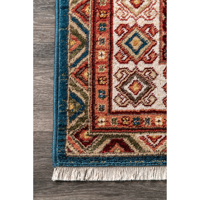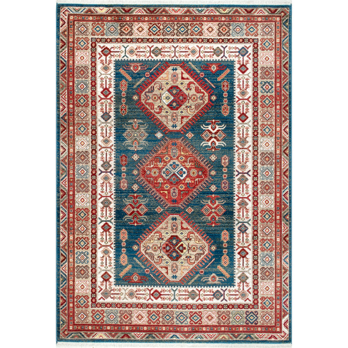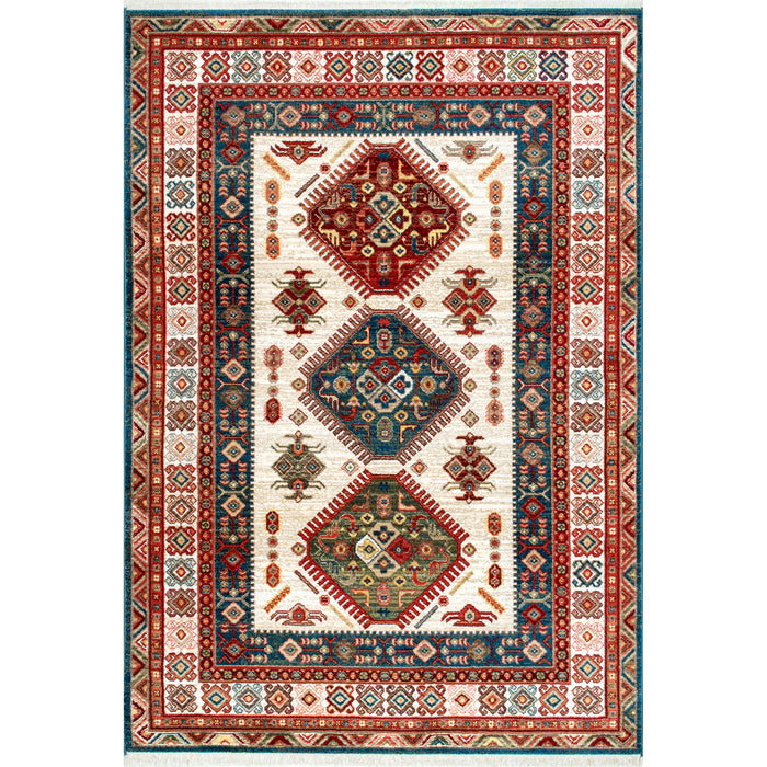 This unique global-inspired pattern is sure to make a statement in your home. Machine made in Turkey of polypropylene, a soft yet durable fiber that is stain resistant. This rug is finished at both ends with a short fringe.