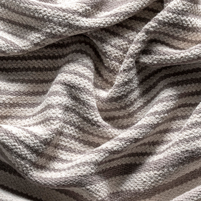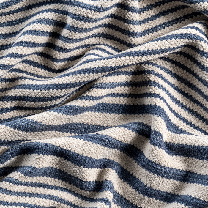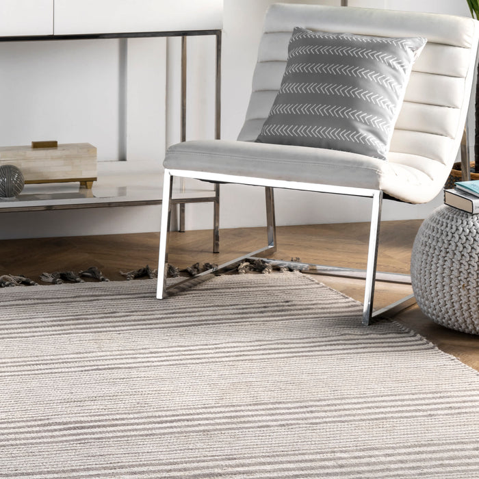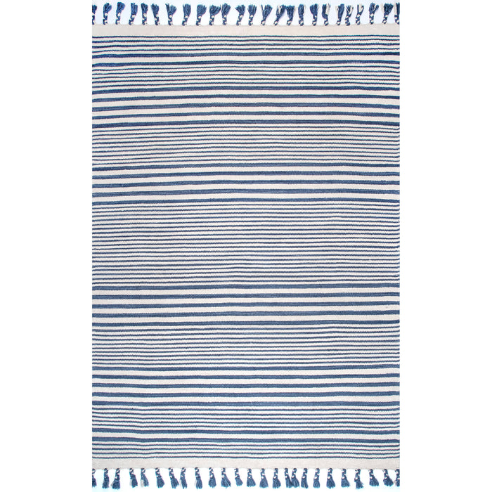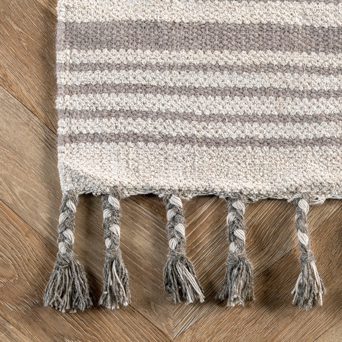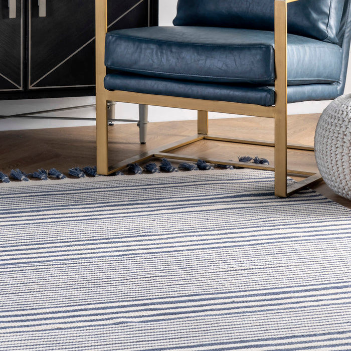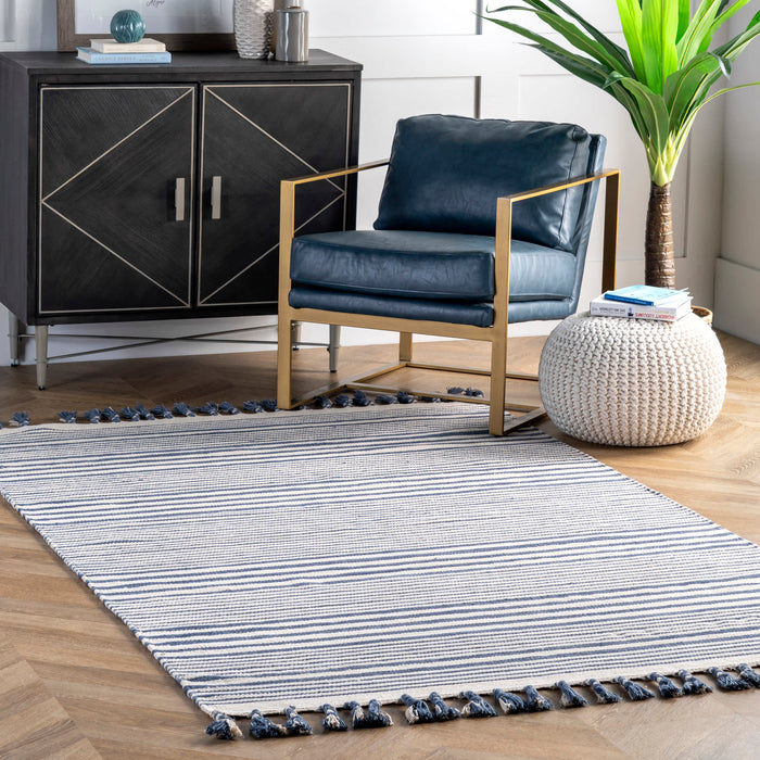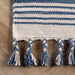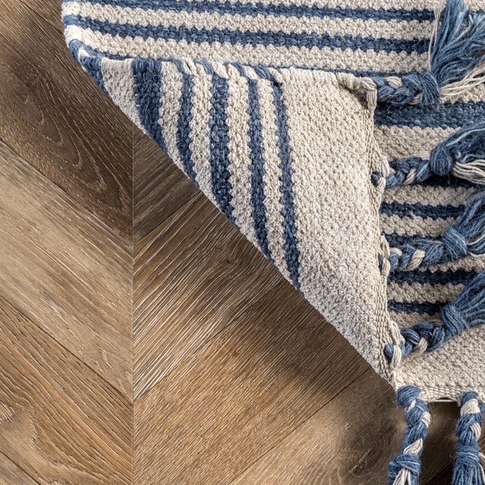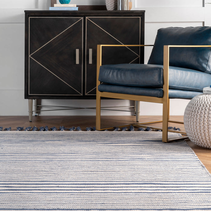This casual striped rug with tassels is handmade from cotton and wool. It is sleek, simple, and refreshingly lightweight. Choose from either colorway for a more nautical or neutral look and feel.