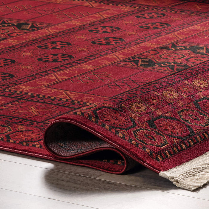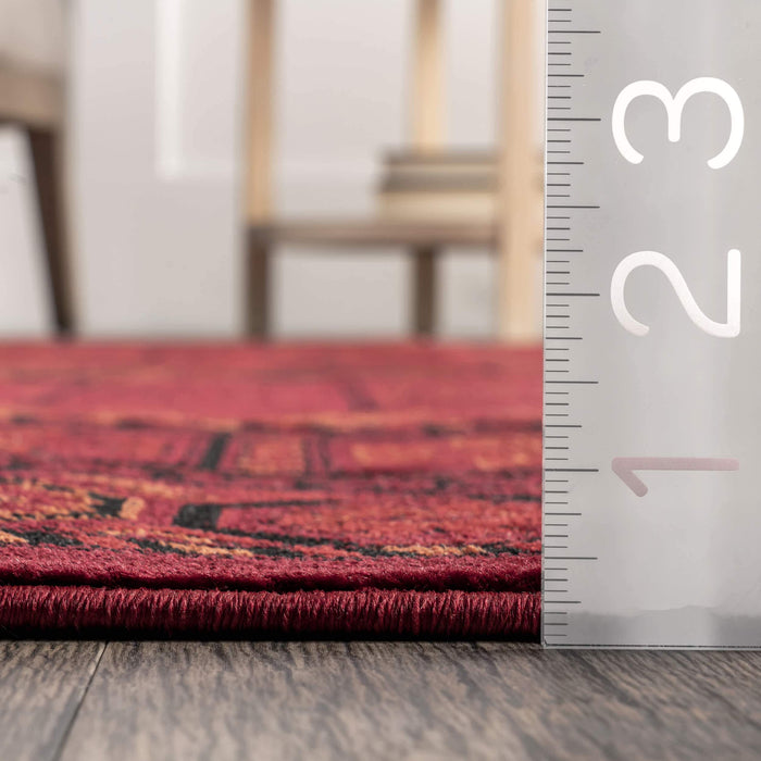 Embrace the deep, rich red hues of this gorgeous floor covering. Featuring a unique pattern inspired by the traditional Persian design, this area rug is sure to make a statement wherever it’s placed. Made from a silky smooth synthetic material, this rug is built to last and withstand frequently used areas of your home.