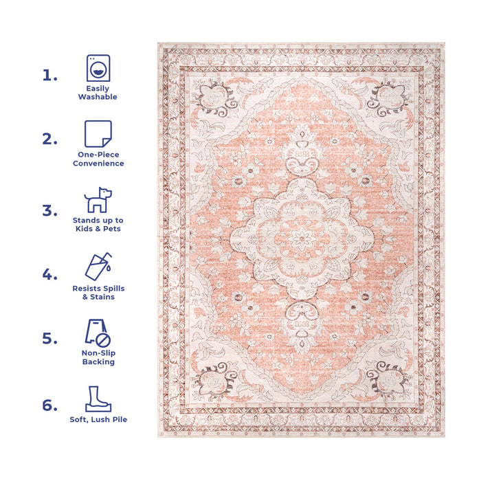 - New and innovative one-piece machine washable rug with the backing layer attached. This conveniently eliminates the hassle of any additional setup, simply lay flat in the desired space upon arrival and after each wash
