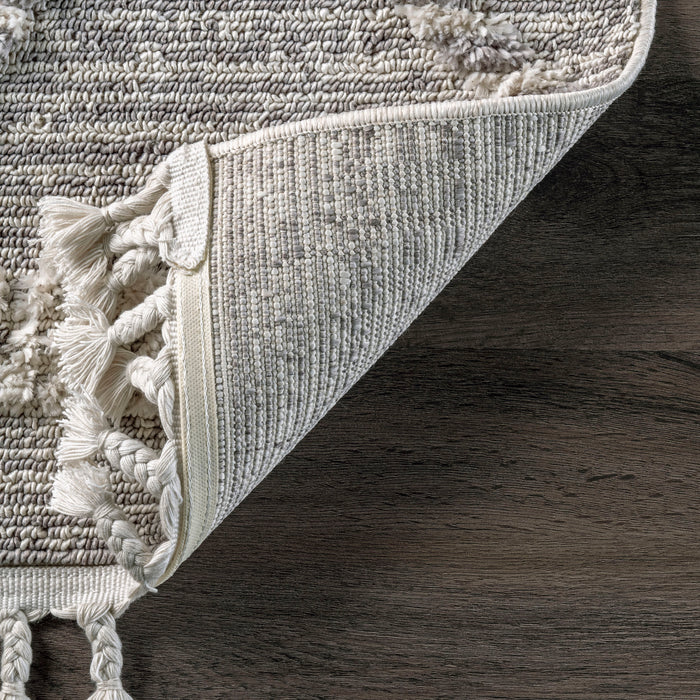 This floor covering has a high/low pattern with a .67" pile height and 3" braided tassels lining each end