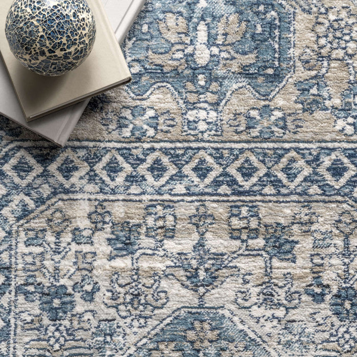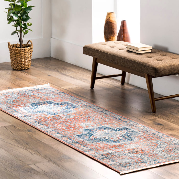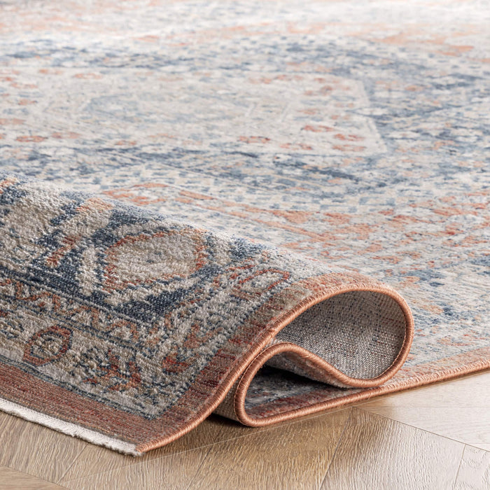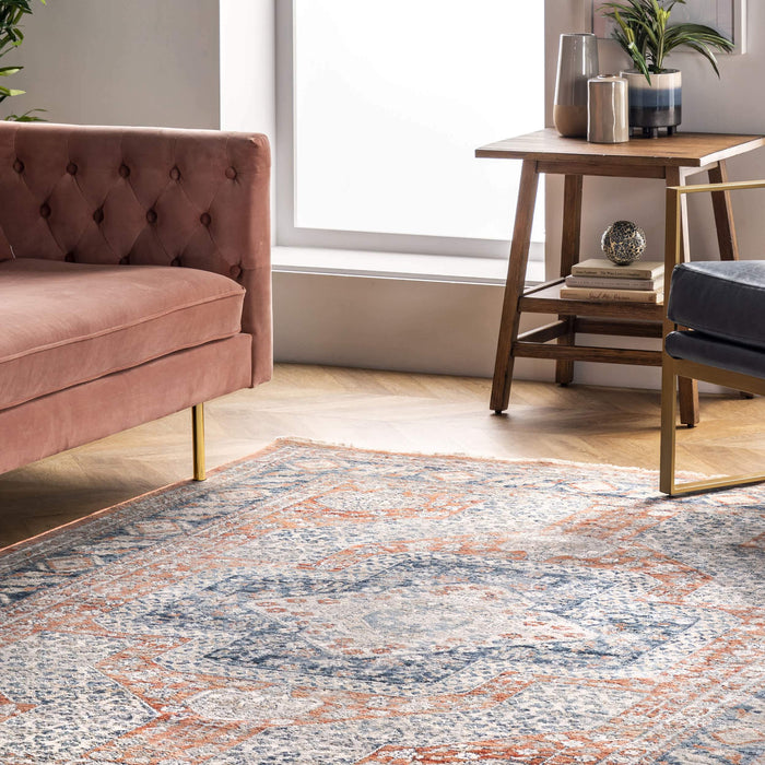 Infuse your space with the charm of this traditional area rug. Its distressed finish elegantly merges with the medallion pattern, evoking a captivating vintage appeal. The vibrant tone introduces a lively pop of color. Made entirely of polypropylene, it ensures durability while providing a comfortable underfoot experience. With its easy-to-clean nature, it's the ideal rug for everyday use from your living room to dining room. Experience classic beauty with a modern twist with this gorgeous floor covering.