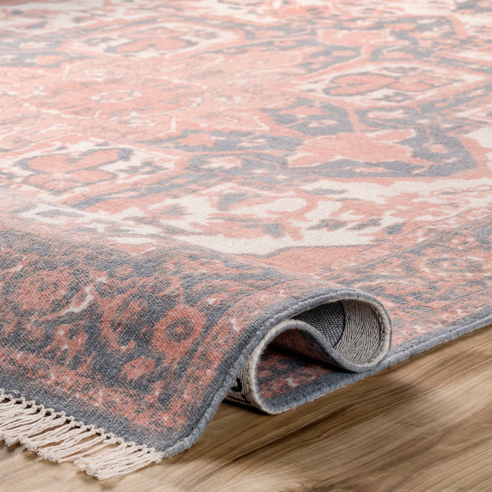 The floral medallion pattern of this rug blends vintage style with traditional comfort. This unique color combination can add charm to any space. Hand woven in India, this wool and cotton rug will warm up any space.