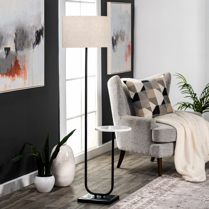 This is the lighting solution that small-space dreams are made of: double the functionality, double the enjoyment. The metal lamp base swoops down and up before ending with a shining marble table, perfect for holding your cup of tea while you read a new book or watch TV. Finally, without a congested side table, there is enough space for lighting and storage. This floor lamp captures it all while adding to the charm of your decor. NuLOOM includes an LED bulb, allowing your lights to take center stage with ease.