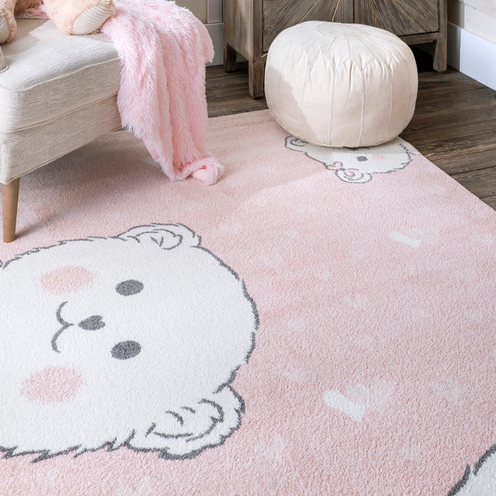 Both children and adults alike are bound to fall in love with blushing bear rug. The soft pastel colorway will make a perfect addition to for your child's playroom, nursery, or bedroom.