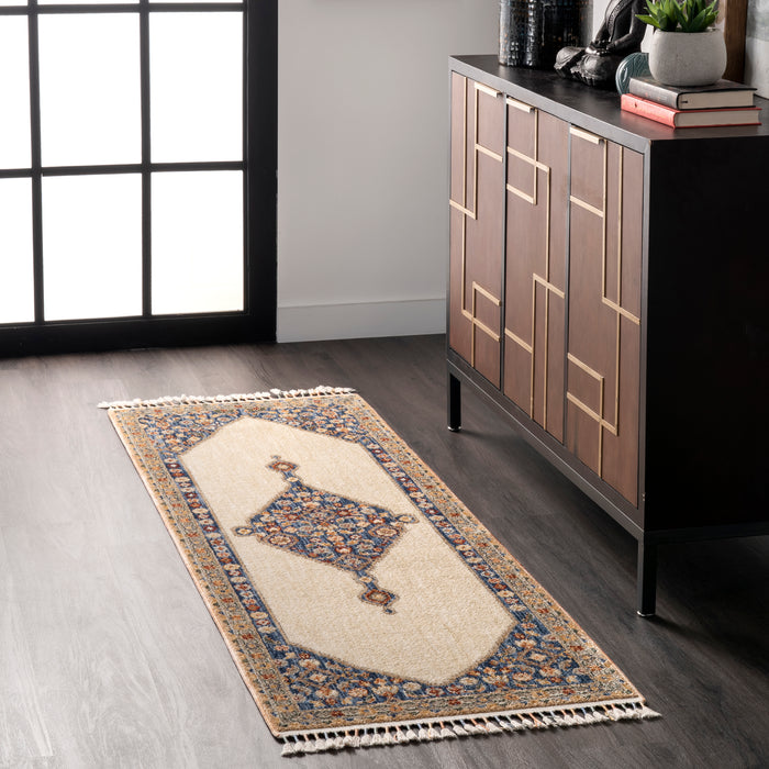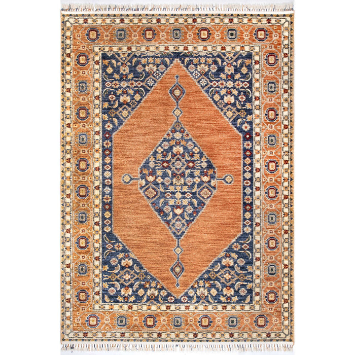 This beautiful vibrant patterned rug features fun and unique wrapped tassels on either end