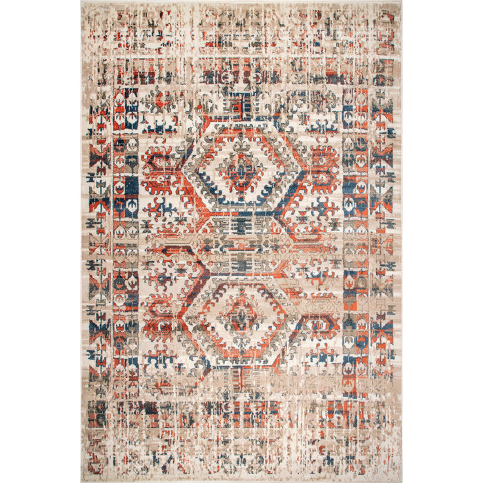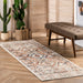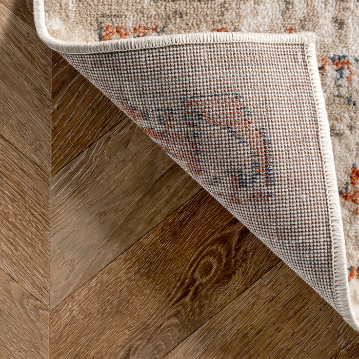 A beautiful earthy color palette and distressed design come together perfectly on this floor covering. Machine-made from silky soft synthetic material, this rug is perfect for you if spills and regular foot traffic are at the top of your mind