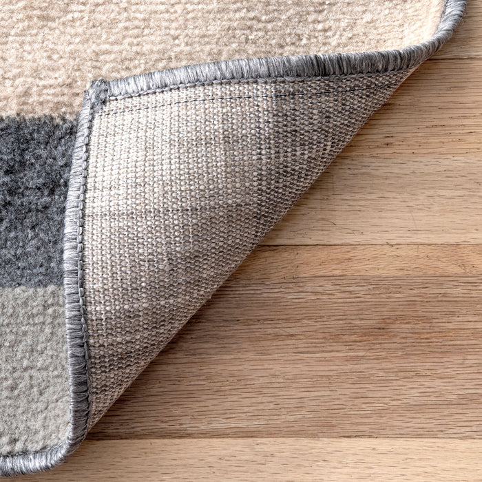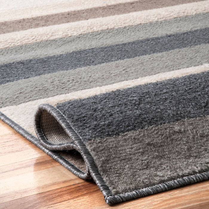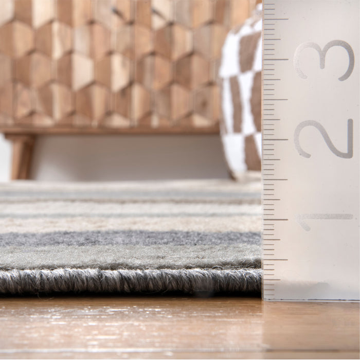 This simple neutral stripe pattern is both stylish and versatile. Machine made in Turkey of polypropylene, a material prized for its durability and ease of care.