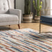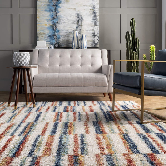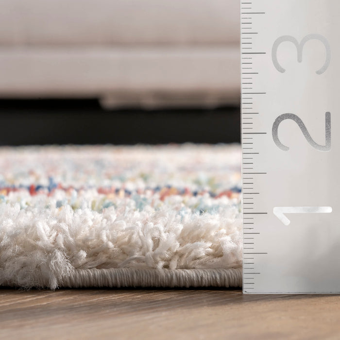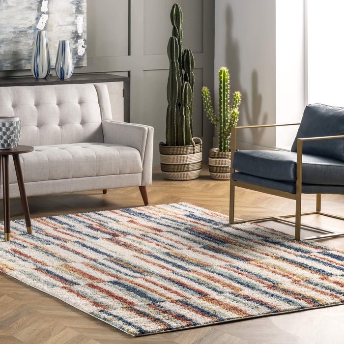 This glamorously shaggy pile features a wonderfully silky texture and striped pattern that is sure to compliment contemporary decor. This rug is machine-made from soft synthetic materials and is built to last even in high traffic areas of your home.