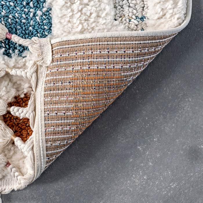 This simple yet adorable pebble like design is the perfect kids shag area rug for a nursery or any room that could use some flare! Braided tassels on the edges of the rug are paired with colorful ties to add a playful element. The combination of rich colors and incredibly soft feeling beneath your feet will make this the perfect addition in your home. Enjoy all of the little moments with our kid and pet friendly rugs.