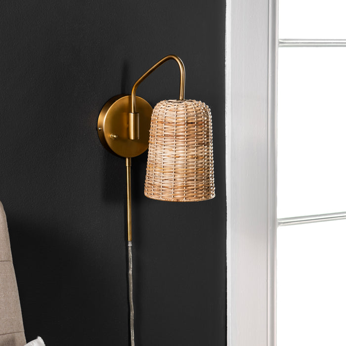 This 1-light wall sconce has a gorgeous brass finish with a rattan shade that brings a coastal feel to your home