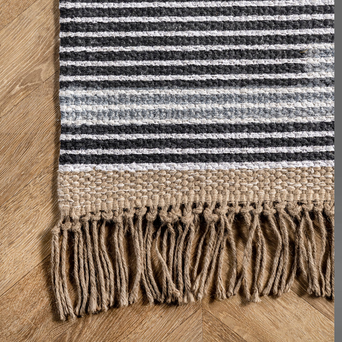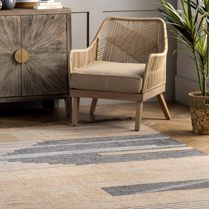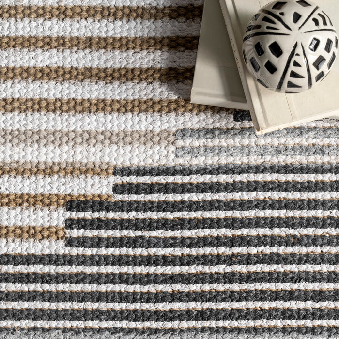 This eye-catching abstract pattern will add a modern flair to any space. Hand woven in India from jute and cotton, this rug embodies a natural and sophisticated look and feel.