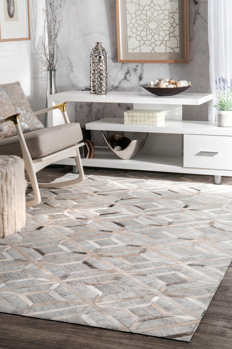 At nuLOOM we believe that floor coverings and art should not be mutually exclusive. Features: Style: Comtemporary, Geometric Material: 60% Viscose, 40% Leather Weave: Handmade Origin: India